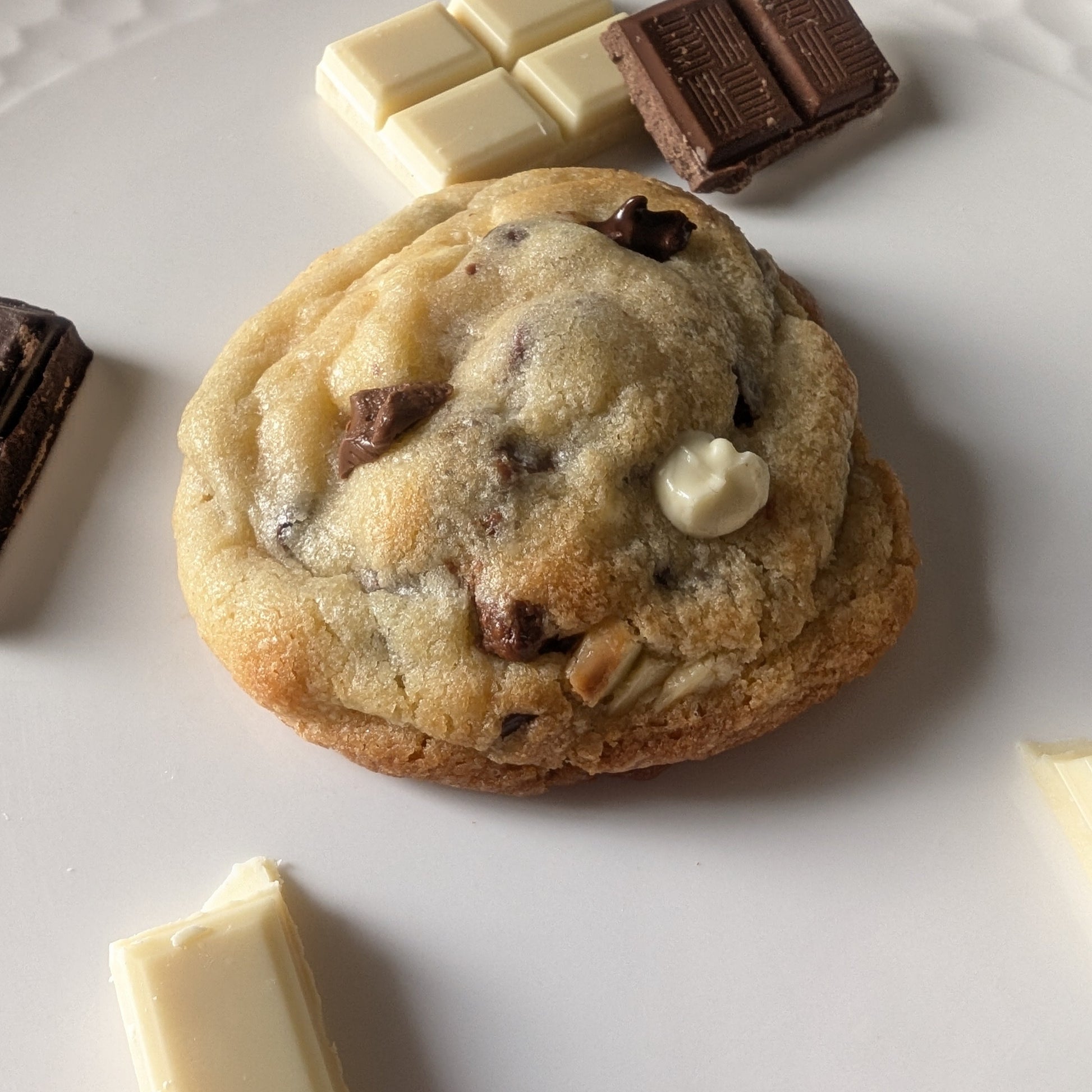 Pâte à cookie vanillée, pépites de chocolat noir, chocolat au lait et chocolat blanc